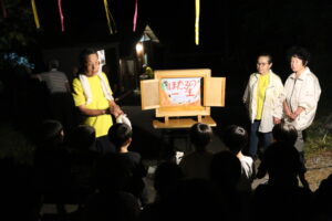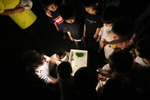 蛍の餌となるカワニナを見せていただいたり、紙芝居を読んでいただいた後、ホタルを探しに行きます。