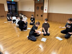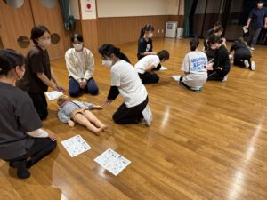 プールの前には、人形を使っての心肺蘇生法(胸骨圧迫)や赤ちゃん向けの後部背打法も行いました。