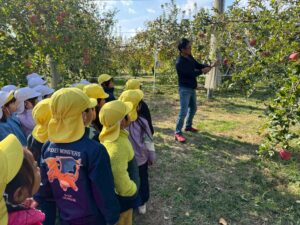 午前中は川場田園プラザで、姉妹園の鼻高こども園のひかりぐみさんと合流し、一緒に遊んだり、お弁当を食べた後、一緒にリンゴ狩りを行いました。